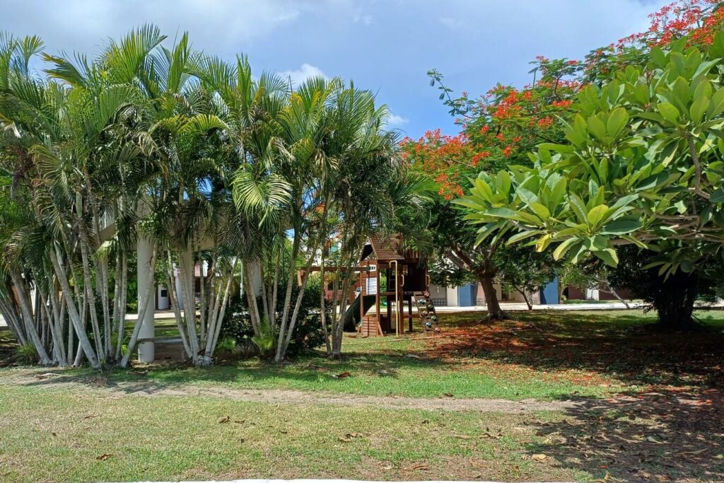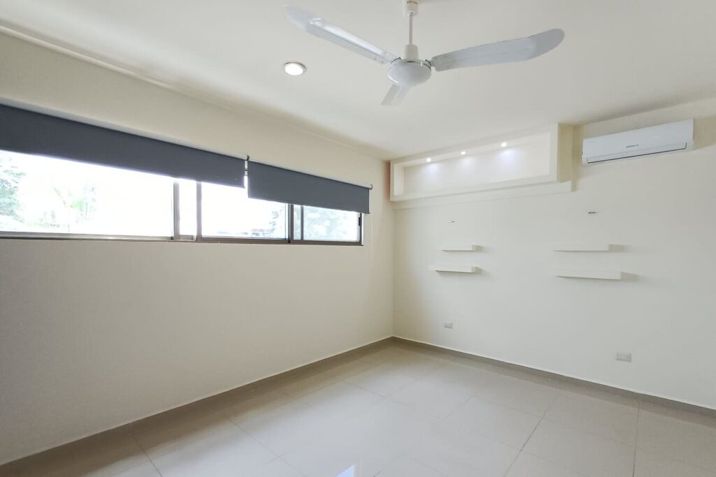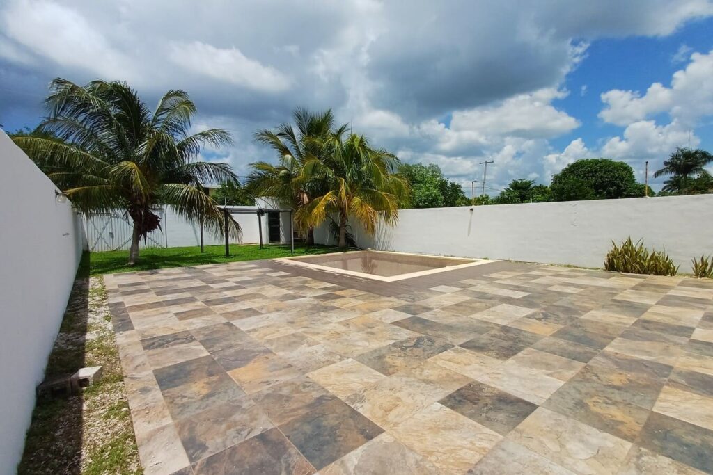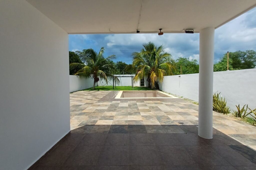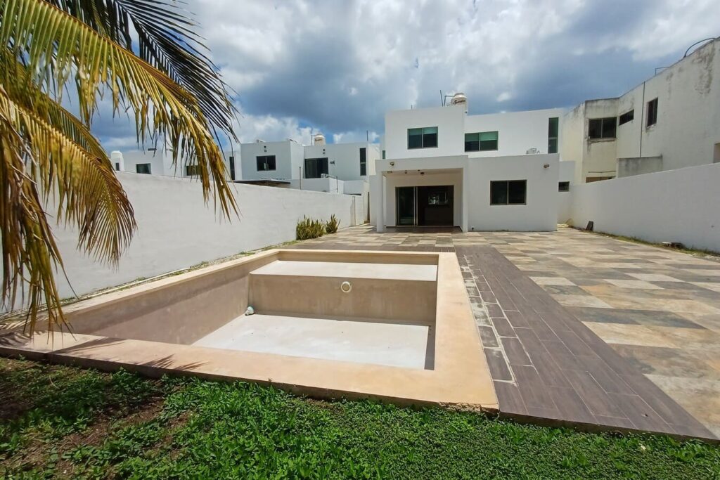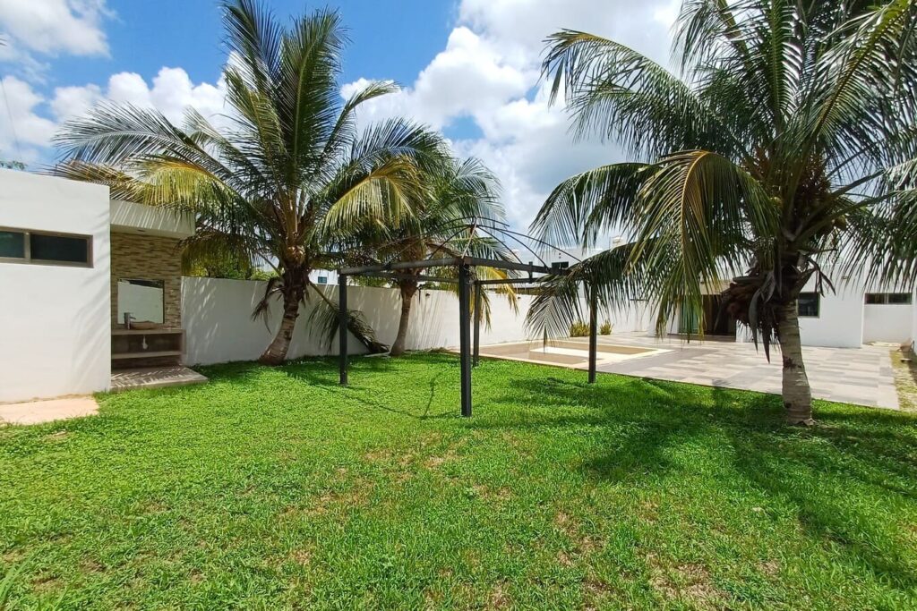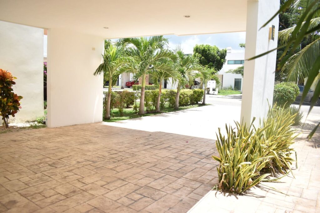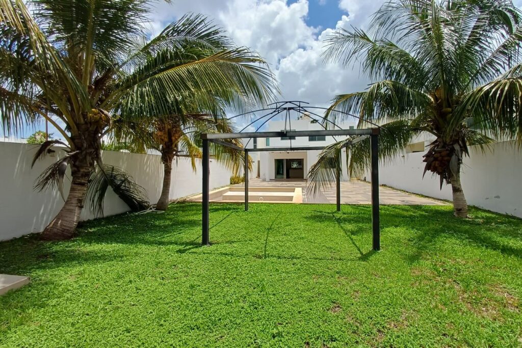 La casa cuenta con espacios amplios, bien ventilados e iluminados, un jardín delantero y un jardín trasero con árboles y palmeras, terraza techada, piscina con baño completo y 4 recámaras climatizadas (una de ellas con balcón). Además, ofrece doble acceso: entrada principal por el frente y acceso posterior directo al jardín.»